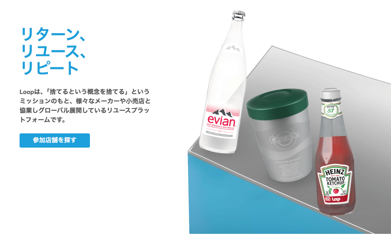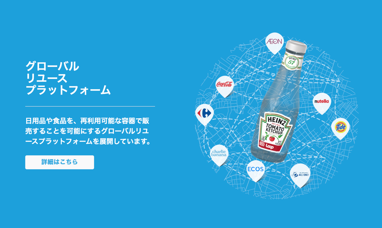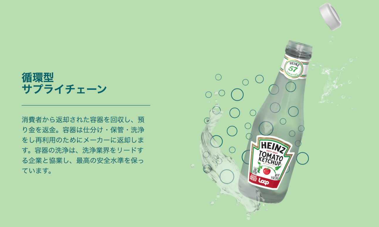 At the top of the page is the tagline “リターン、リユース、リピート” (Return, Reuse, Repeat). And if you notice, the ketchup bottle movement aligns with the tagline: